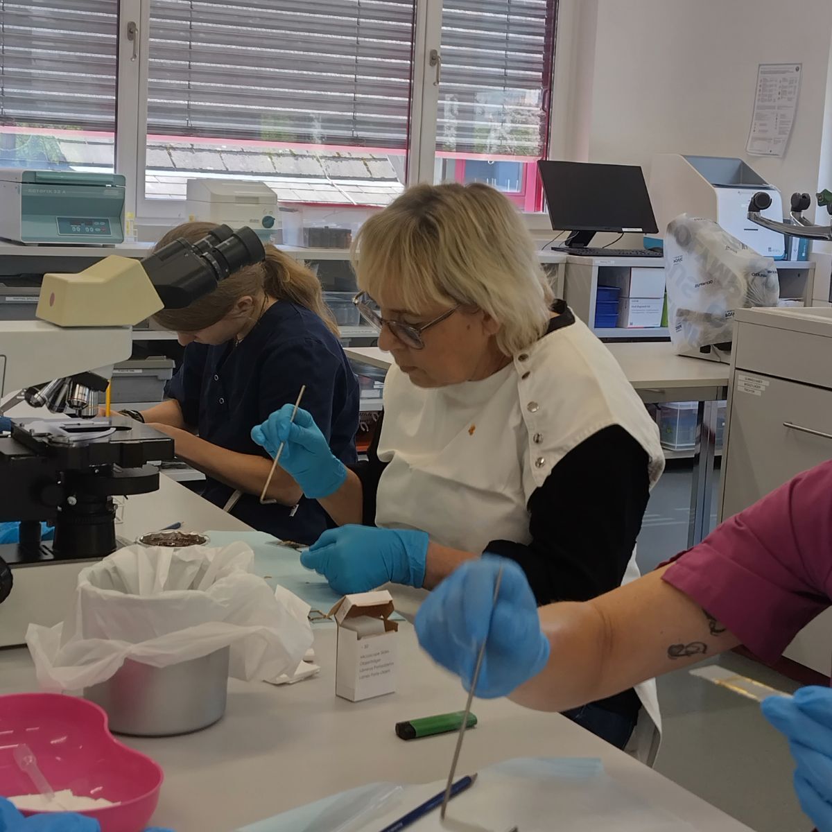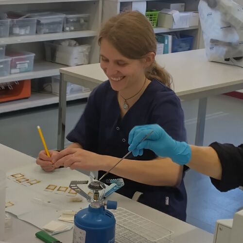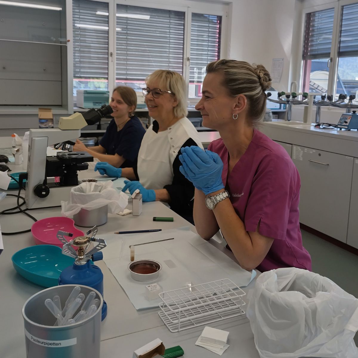 Diese Präparate sind in der Herstellung sehr aufwändig und wenn wir sie anschaffen müssen auch entsprechend teuer. Aus diesem Grund hat sich das Laborteam zu einer Schulung mit Frau Stürmann getroffen und wir haben gelernt, wie die Proben vorbereitet und anschliessend korrekt eingebettet werden müssen. Auch wurden wir in der Herstellung von Ektoparasitenpräparaten (Zecken, Milben, Flöhe etc). geschult.